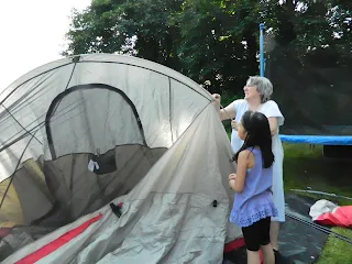 Our five man tent is 20 years old and sleeps four. I've been wanting a bigger tent. I found one in a flyer that I wanted, an 8 man. Ohhh, ahhhh. It will be huge and we'll have room for all our clothing and the porta potty and it will be wonderful. Eric bought it for me Friday and my plan for Saturday was for the girls and I to set it up on our own because we'll need to do it on our own next Friday. Pulled the whole thing apart and there were no instructions. Seriously. I know a lot of people can just look at stuff and put it together but Fei and I just laughed. Mom was there too but she was trying really hard to stay out of it because the girls and I needed to learn. The packaging says 15 minutes to put up. It was an hour and a half for Fei and I. Lili turned out to be very little help. Jia tried, bless her, she had her hands on something almost the whole time but she wan't ever actually any help :) So, it was hot and frustrating and funny. We finally got it up and our 8 man tent looks like it will sleep 4. Arg. It does have a nice screened in outside section that will work for the porta potty and shoes. Grandma came over later for a sleep over in it, she squished in between the girls. Jia was too keyed up to even lay down so we called Eric at midnight to come and get her. She stayed up with Eric until 2am. The rest of us had a great sleep in the new tent. We asked Jia if she wanted to sleep in the tent the next night and she said 'no tankyou'. Will try to get a picture of it actually up this weekend.