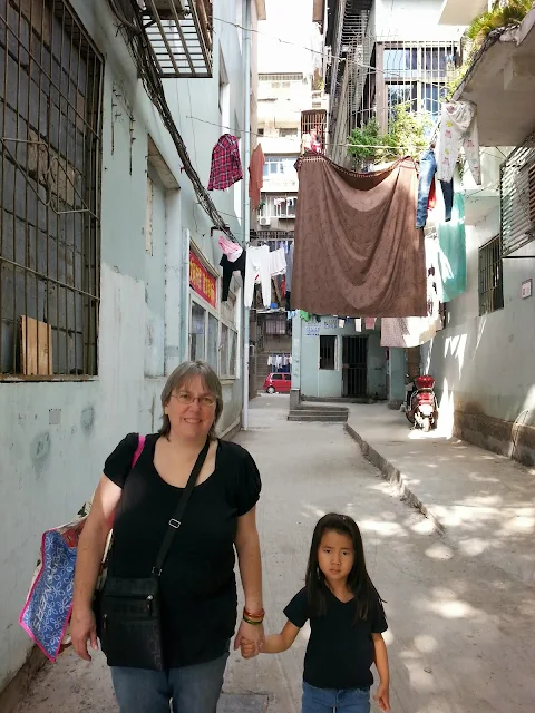 Nice walk today. Sun is out. Warm in t-shirts. Locals are bundled. Lots of staring. Only one clothing granny gave us crap for Jia's bare arms. Should consider giving them her long sleeve shirt and get them to get it on her. She just keeps telling us she likes to be cold.