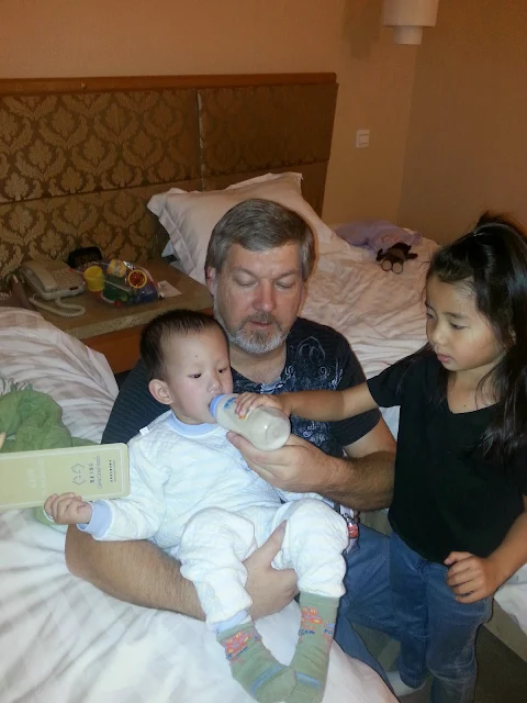He is quiet for the most part. Still really watching us intently. Eric put him down and he can walk with assistance. Ok a lot of assistance. He is moving forward and seems to have good strength. He wanted out the door and the three of them walked the hallway for a while. He can stand holding himself up while leaning on the bed. He wasn't so sure about tummy time. He's taking a bottle now. We have to be in the lobby at 8am to go adopt him.