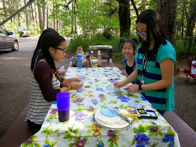 We camped with friends. 15 kids. Fun group. Five bigs 12 - 13, five middles 10- 11 and five littles, 3,4,5,6 & 7.