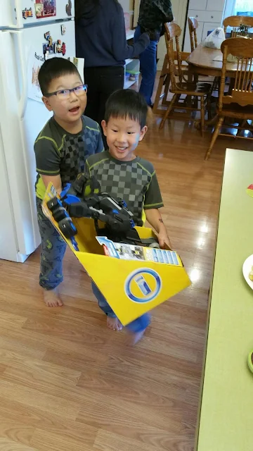 Luk got a super cool gift from Gramma. It's a talking robot/car tranformer, remote controlled and it does 100 things. It's what he wanted. It does WAY more than he expected.